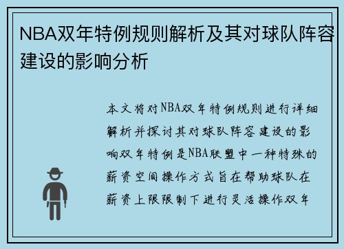 NBA双年特例规则解析及其对球队阵容建设的影响分析